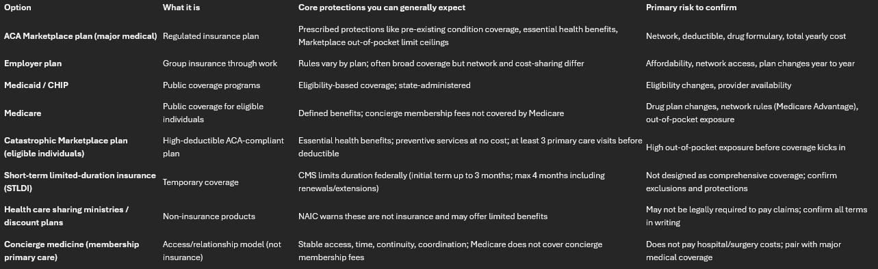For 2026, many people are comparing ACA Marketplace plans, employer coverage, Medicare, short-term products, and membership-based primary care models. This guide explains what each option really is, what protections come with it, what to confirm before you enroll, and the key dates and cost ceilings that matter for 2026. Educational only; not legal, tax, or medical advice.